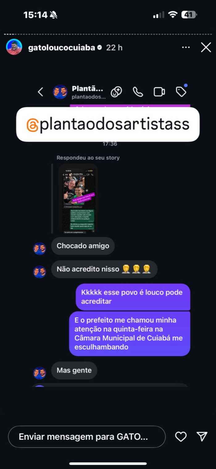 Em outro trecho, Gato Louco afirmou que foi chamado a atenção pelo prefeito durante sessão na Câmara Municipal de Cuiabá, classificando o episódio como constrangedor.