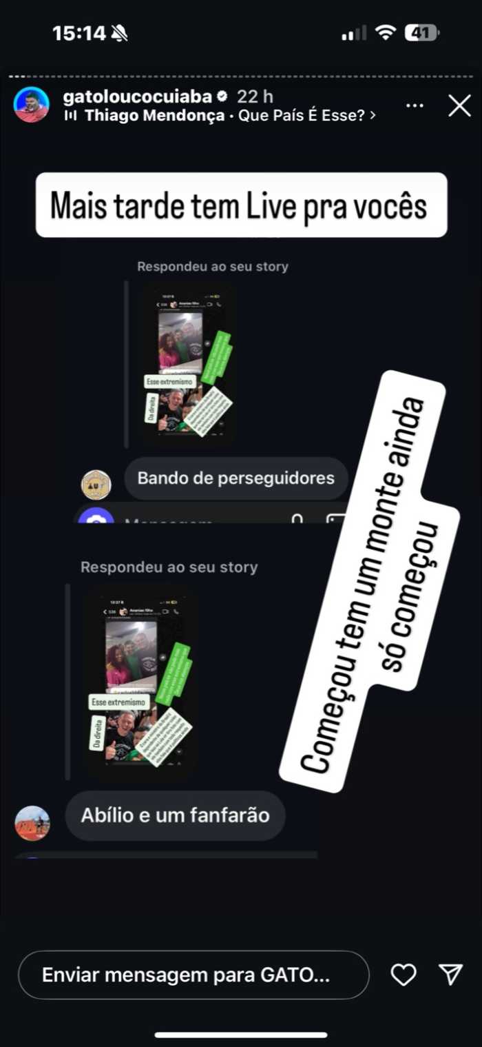 Nos stories publicados, Gato Louco relatou que recebeu críticas de apoiadores e mensagens privadas de pessoas dizendo que teria sido “traído de novo pelo Abílio”, além de comentários de que “não amadureceu” e que “a vida ainda vai ensiná-lo a ser um político de verdade”. Ele também revelou que recebia cerca de R$ 2.620 como motorista, mas com ajudas extras o valor ultrapassava R$ 4 mil.